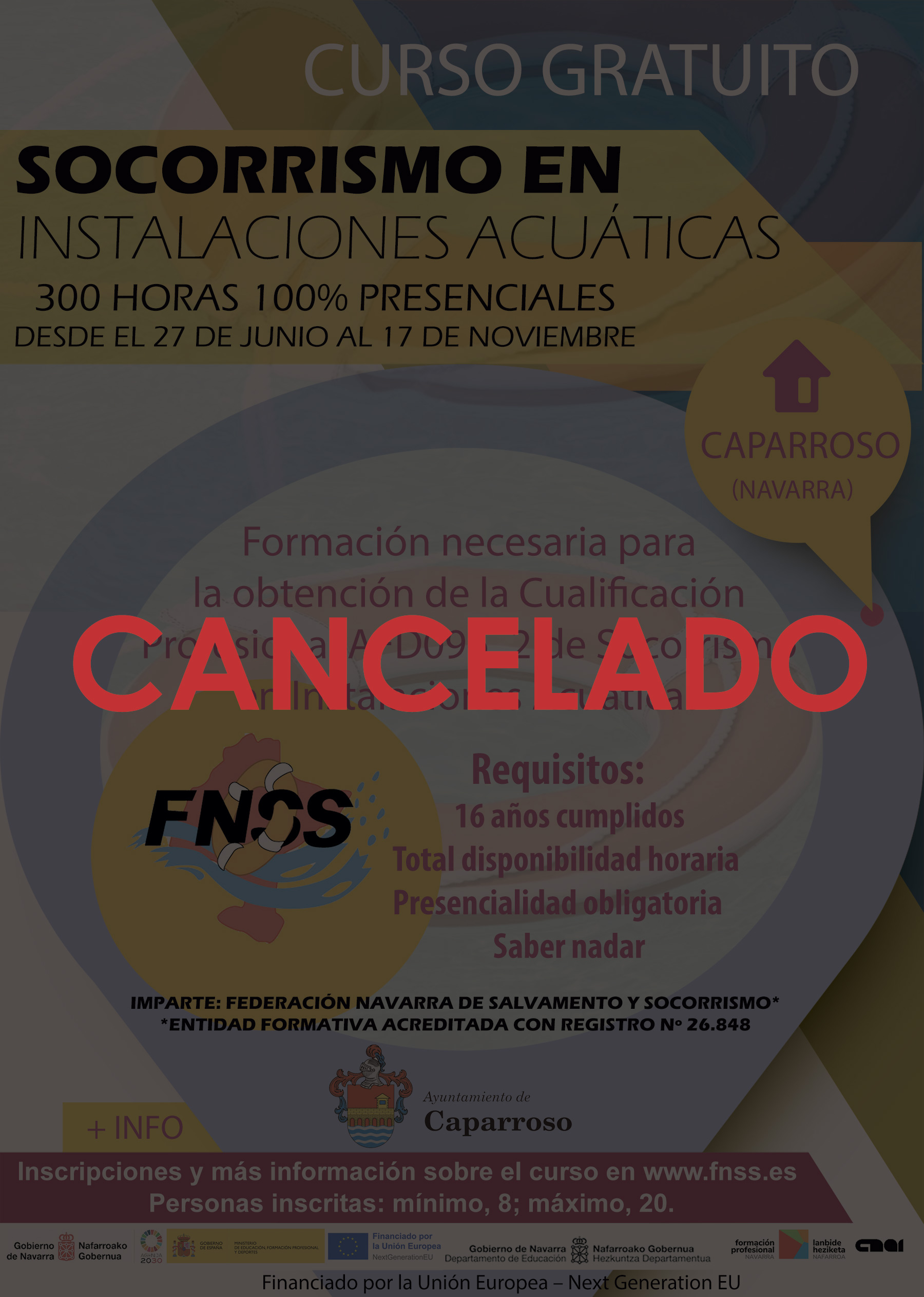 La Federación Navarra de Salvamento y Socorrismo ha cancelado el curso de Socorrismo en Instalaciones Acuáticas por falta de inscripciones, ya que no se ha alcanzado el número mínimo necesario. Pedimos disculpas a las personas que se inscribieron y esperamos que en futuras formaciones se pueda llegar al mínimo necesario para su realización