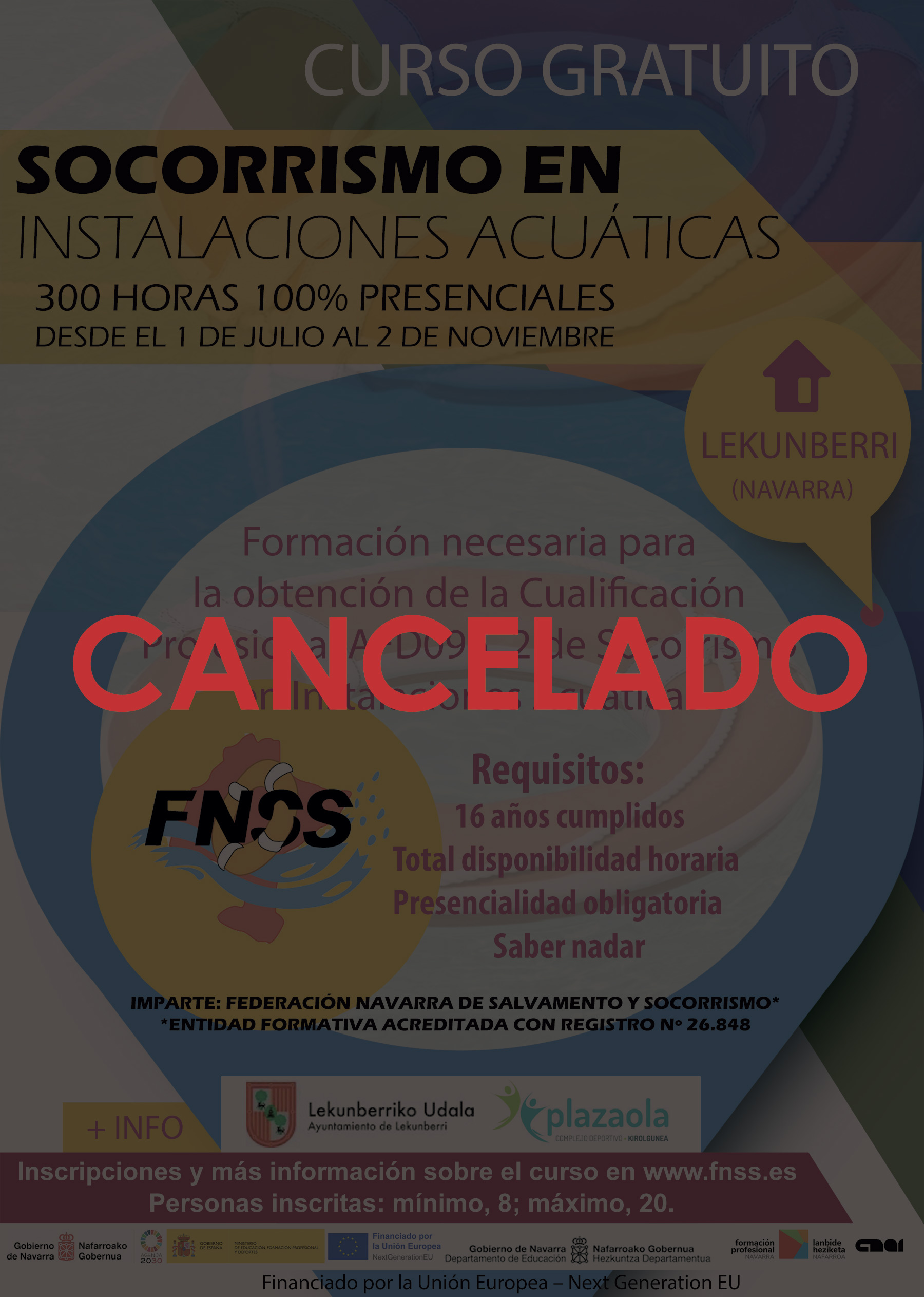 La Federación Navarra de Salvamento y Socorrismo ha cancelado el curso de Socorrismo en Instalaciones Acuáticas por falta de inscripciones, ya que no se ha alcanzado el número mínimo necesario. Pedimos disculpas a las personas que se inscribieron y esperamos que en futuras formaciones se pueda llegar al mínimo necesario para su realización